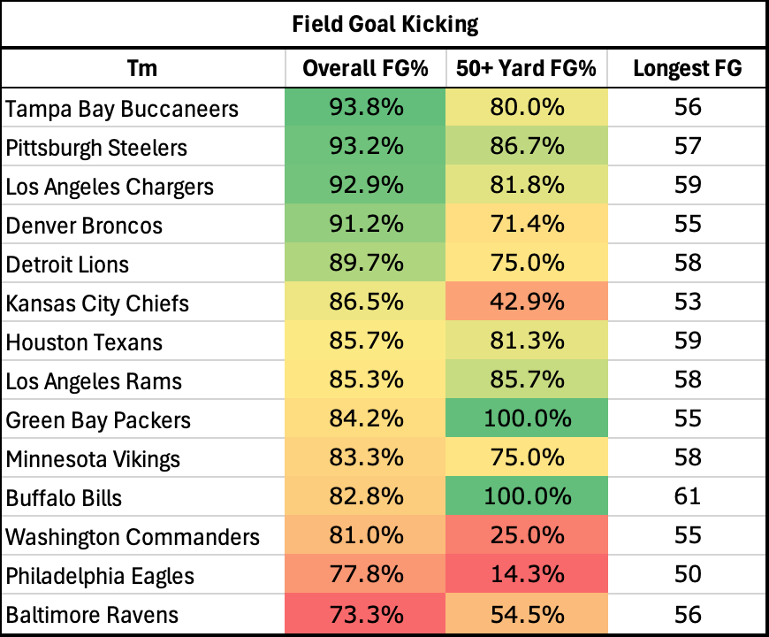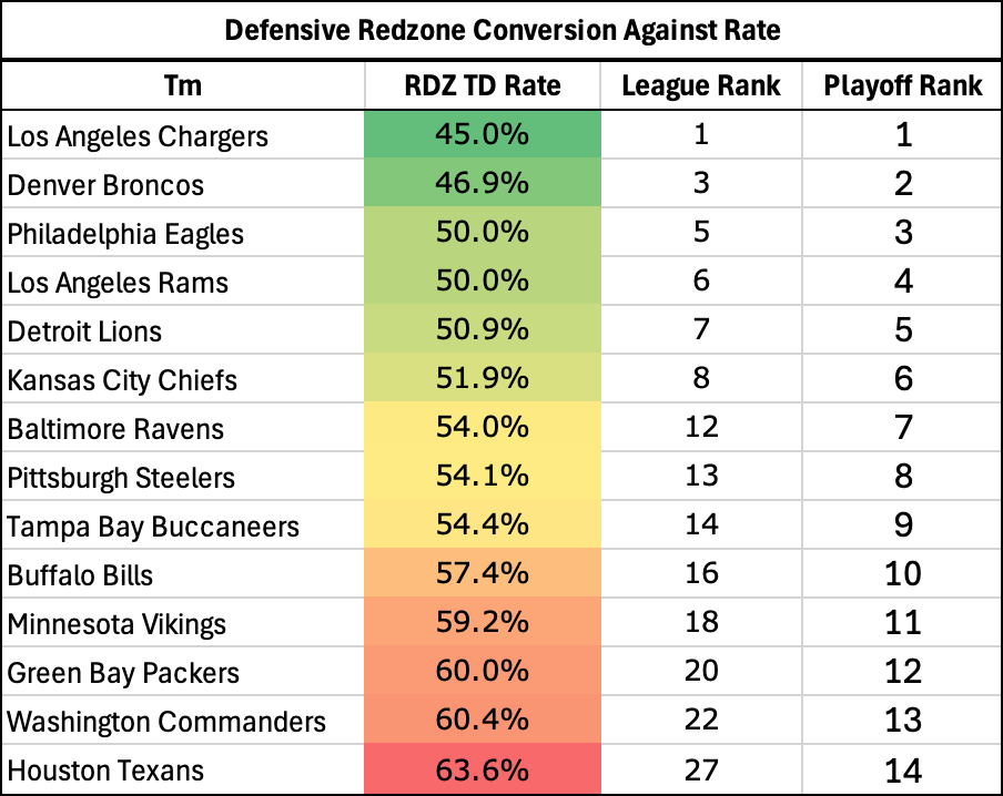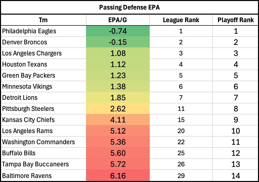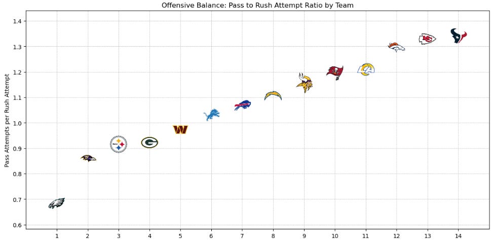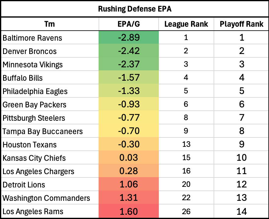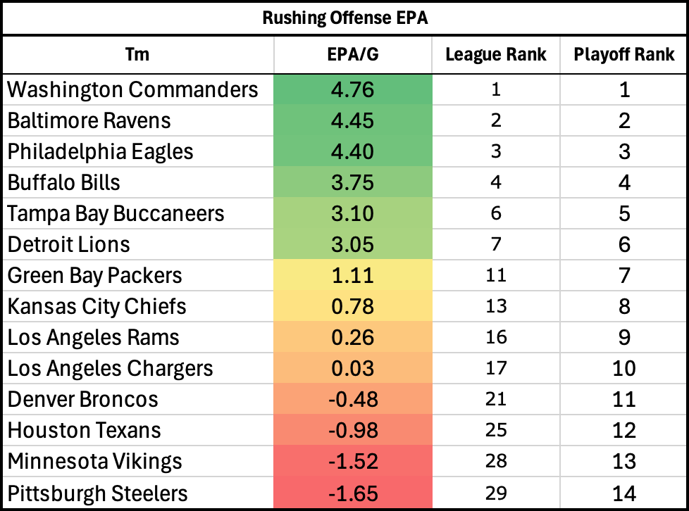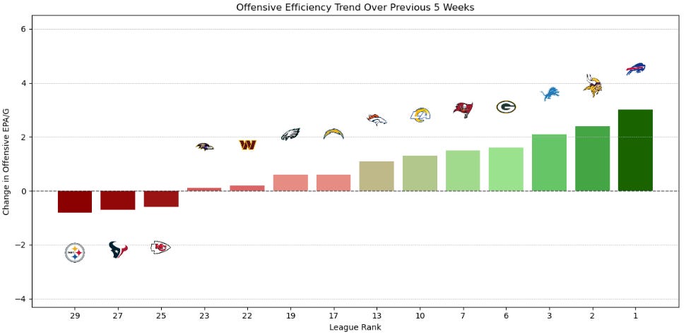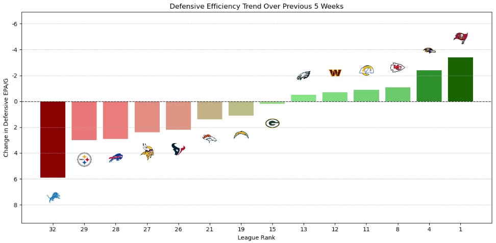 Quick Analysis: Because this is data from before Week 18, this graph does not see the impact of Detriot’s big defensive performance against the Vikings to win the division. But still, one good game may not be as significant as the impact of all their injuries between Weeks 13-17. The Buccaneers are the most positive trending defensive unit heading into the playoffs. They will have their hands full with Jayden Daniels so let’s see if this improvement is enough.