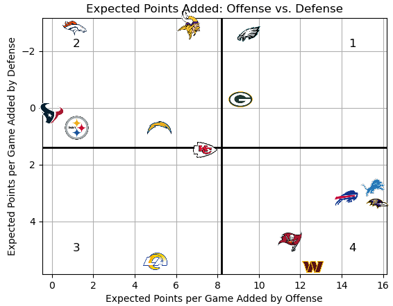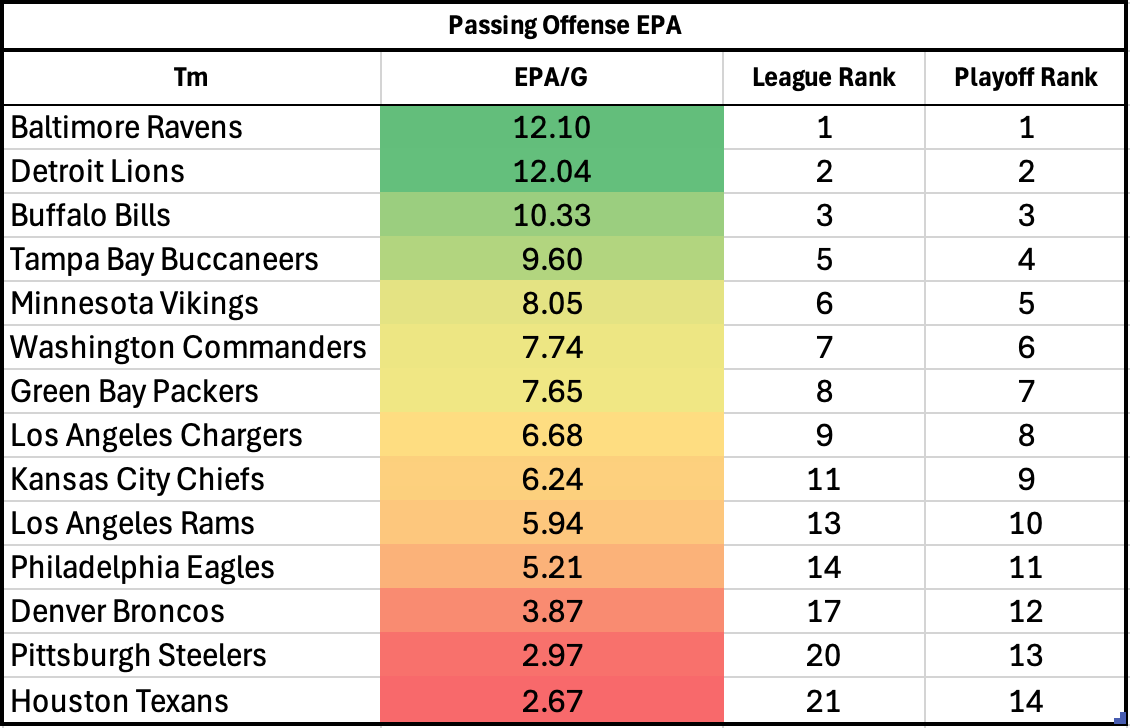 Quick Analysis: This graph shows the rise and fall of offensive EPA from Weeks 13 through 17. Teams above 0 have improved their offensive efficiency heading into the playoffs and are playing better now than they were 5 weeks prior. Teams below the line, Chiefs, Texans, and Steelers are trending downward offensively heading into the playoffs. For the Bills spread pick, let’s also hope they continue to play their best ball on Sunday.