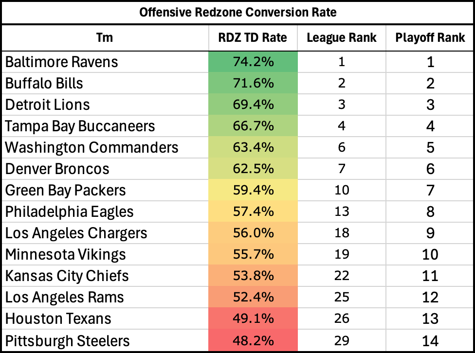 For as many charts as possible, I have filtered for team data to exclude bad data from Week 18. However, for a few, it unfortunately wasn’t possible to do so. I have filtered out all the teams that did not make the playoffs, so let’s see how the league’s elites stack up:
