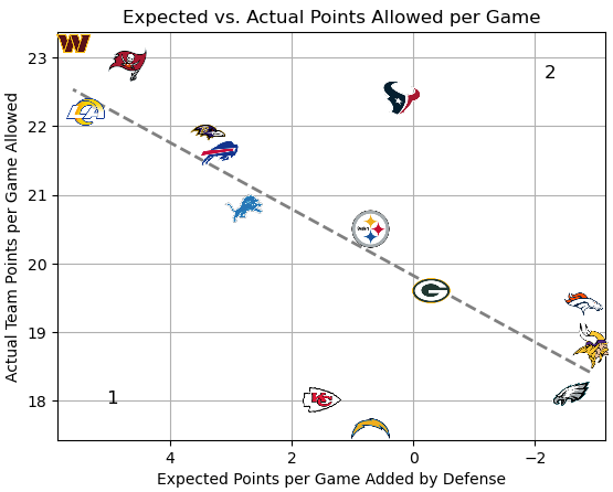 Quick Analysis: While the Chiefs and Chargers have allowed very few points this year, their efficiency suggests these units may be overvalued and ‘should’ be thought of as 20ish PPG-allowed defenses. Meanwhile, the Texans are the most glaring outlier on the Side 2. While they have allowed more than 22 PPG this year, their advanced metric suggests they might be undervalued and play more like a 20 PPG unit.