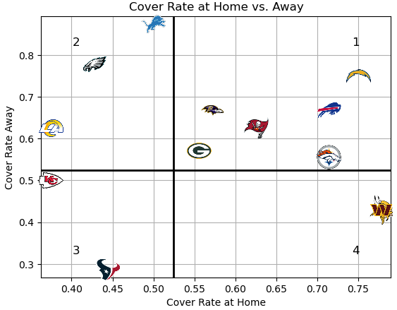 Quick Analysis: The cover rate graphs do not include data from Week 18. The lines here are set at 52.4%, the break-even profitability rate against the spread. The Commanders and Vikings have dominated against the spread at home, but each has been a good team to fade so far on the road. Meanwhile, teams like the Rams, Eagles, and Lions have all been better bets on the road than at home.