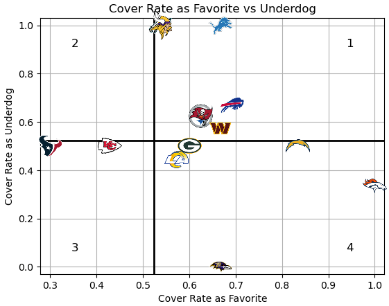 Quick Analysis: For some of these teams I think the Home/Away splits tell a better story than the Favoirte/Underdog ones. Teams like the Ravens and Lions were each underdogs just once. For Baltimore, it was their very first game, the Isaiah Likely ‘toe on the line game.’ For the Lions, it was Week 7 against the Vikings. Detroit happened to win and cover while Baltimore did not. Does that mean you shouldn’t take Baltimore because they covered 0% ATS (0/1) as an underdog if they go on to win and get points next week? Not necessarily. Or at least that shouldn’t be the reason you don’t take them to cover. The most interesting team here to me is the Broncos. As of when we give out picks on Friday Mornings, Denver has been favored 7 times. Unless I have messed up our data or put something in incorrectly, they have covered all 7 games. This means they have beaten up worse teams. But when Denver is the one getting points and they are playing a better team, they have covered just 3/9 times. This is yet another trend we hope continues on Sunday as they are getting a lot of points in Buffalo.