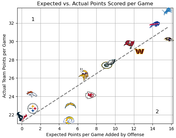 When we reset these graphs to only look at the playoff teams, aka the best of the best, only two teams find themselves in Quadrant 1 of our overall efficiency graph. Meaning only two teams are above the playoff average according to EPA both offensively and defensively. And while one of them is Philadelphia, the other is Green Bay. So one of the only two teams that is elite on both sides of the ball is getting 4.5 points. The numbers above are season-long averages. Another important factor is your form going into the playoffs. Because the chart doesn’t include Week 18 due to bad data, the offense and defensive efficiency trends are looking at how teams either improved or declined over the last 5 weeks of meaningful football. The Packers were the 6th most positively trending offense in the league down the stretch, good for 4th amongst playoff teams. The Eagles rank just 19th in the league here. These two offensive find themselves in almost identical places in our Expected vs. Actual Points Scored per Game graph. This means they are actually scoring exactly as many points as they ‘should be’ according to EPA. But one of these units is greatly improving and playing their best now while the other one is stagnant.