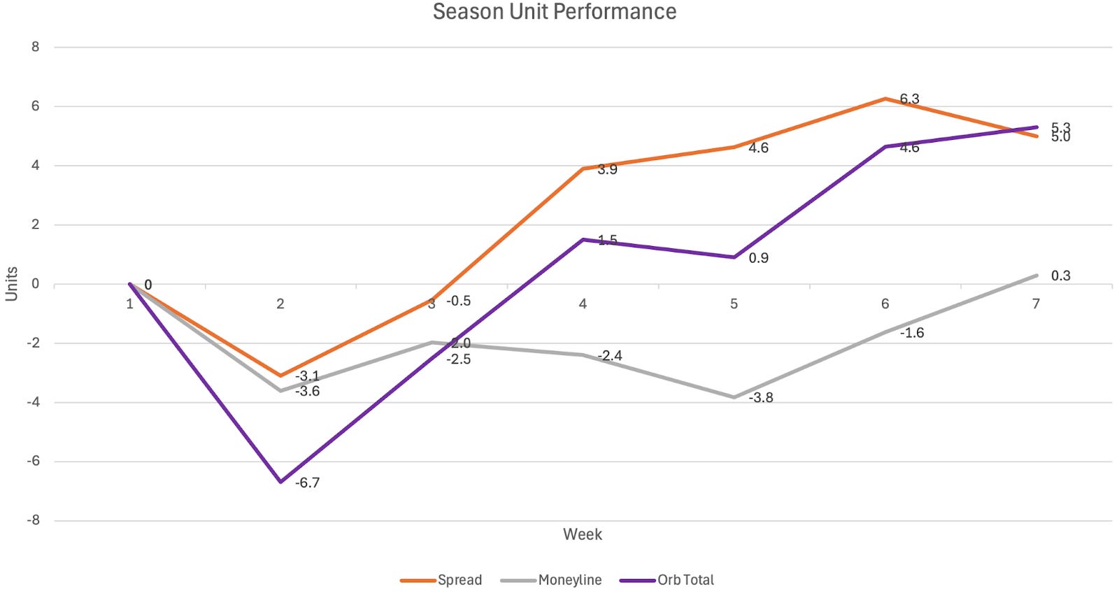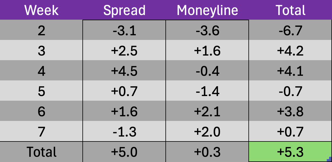 Overall a negative performance from our spread models but a positive from our moneyline ones. Our official season accuracy dropped just below 60% for the first time since the end of week 4. But again, one or two more misses this week would have resulted in a more significant percentage drop. This was the first week that a losing spread performance was lifted by a greater +unit moneyline one and resulted in a winning weekend overall. It was the opposite of week 5 where we technically lost -0.7 units because of the moneyline models but had a winning week from our spread predictions, which we care more about. After starting our official season -6.7 units overall in week 2, it is really rewarding to see both models above the profitability line and and at their highest overall unit total so far this year.